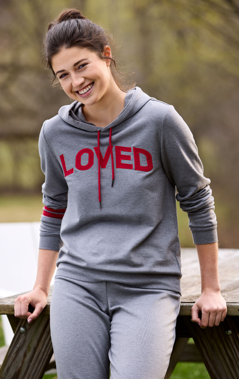 Sleeping is a serious sport in the Loved Hooded Pullover Set. Ultra-soft and warm but lightweight and breathable these pajamas are perfect for relaxing after a long day. Featuring a heather gray color decorated with rich red accents and a ”Loved” saying across the front of the hoodie. So go ahead and rest those tired muscles.